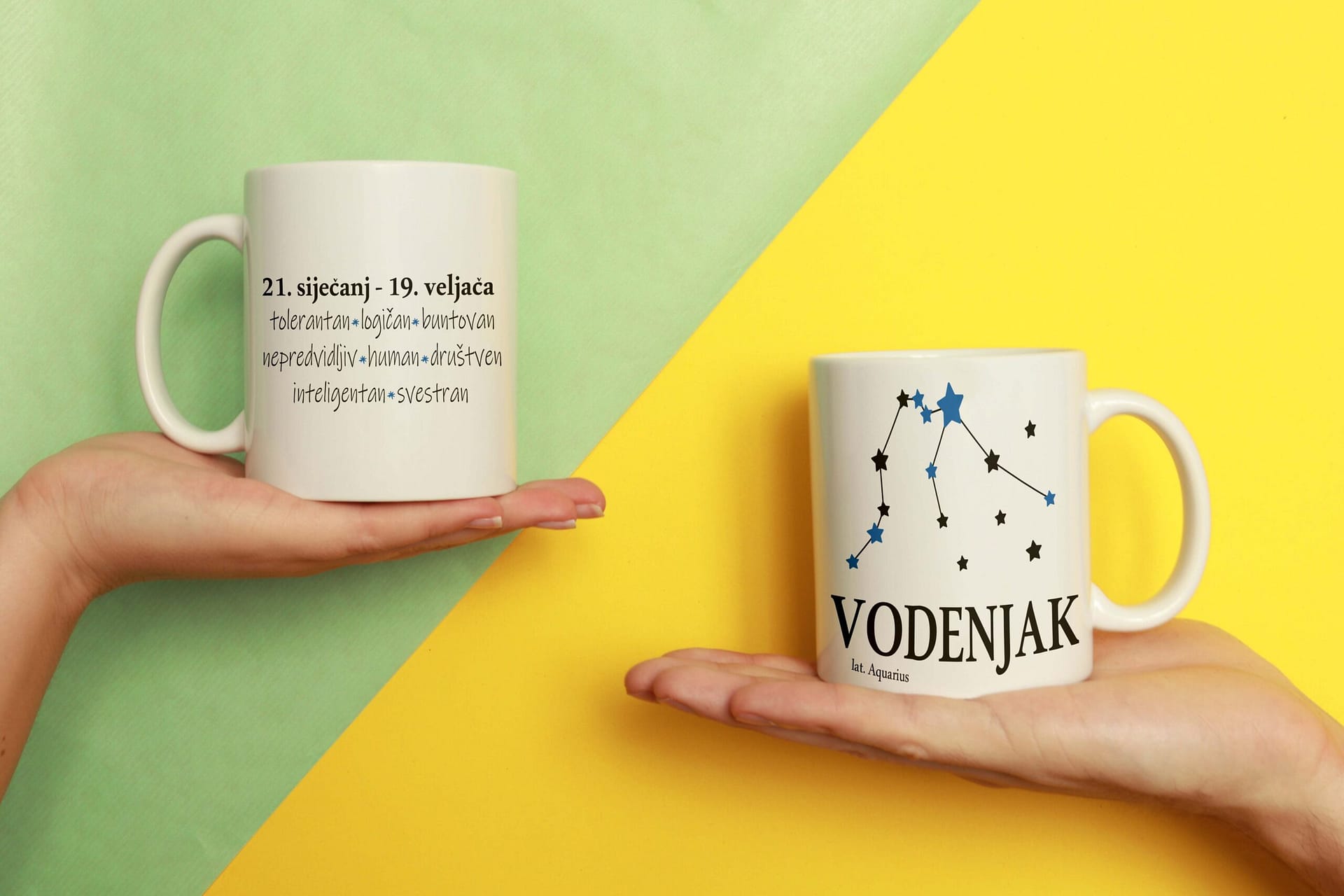 Šalica sa zviježđem Vodenjaka i osobinama osobe s druge strane.